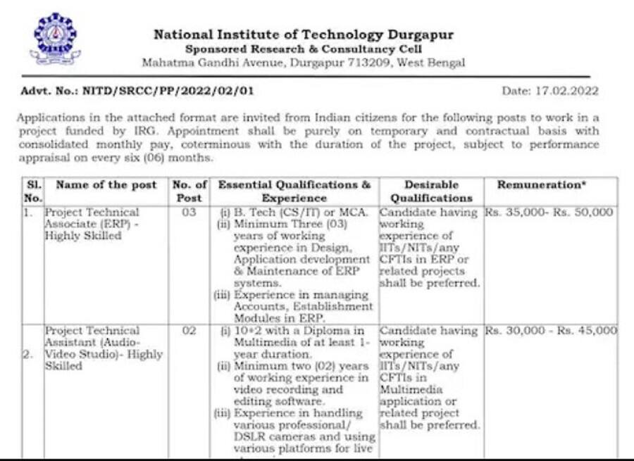 দুর্গাপুর ন্যাশনাল ইনস্টিটিউটের(NIT Durgapur) (এনআইটি) তরফ থেকে একটি বিজ্ঞপ্তি জারি করে যোগ্য প্রার্থীদের আবেদন পত্র চাওয়া হয়েছে। যদিও প্রাথমিকভাবে চুক্তিভিত্তিক কর্মী হিসেবে নিয়োগ করা হবে তাদের। কাজের পারফরম্যান্সের ভিত্তিতে চুক্তি বর্ধিত করা হবে ছয় মাস অন্তর। মোট পাঁচটি শূন্যপদে নিয়োগ করা হবে। যাদের মাসিক ৩০ হাজার টাকা থেকে ৫০ হাজার টাকা পর্যন্ত মাইনে দেওয়া হবে। দুর্গাপুর ন্যাশনাল ইনস্টিটিউটের সঙ্গে আইআরজি (IRG) এর ফান্ডিংয়ে পরিচালিত প্রোজেক্টে নিয়োগ করা হবে কর্মীদের। দুটি ভিন্ন পদের জন্য নিয়োগের বিজ্ঞপ্তি দিয়েছে এনআইটি।