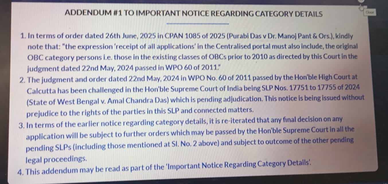যদিও অভিন্ন পোর্টালের মধ্যে একটি বিজ্ঞপ্তি দেওয়া হয়েছে সেখানে উল্লেখ করা হয়েছে ২০২৪-র ২২ মে হাইকোর্ট থেকে দেওয়া আইনকেই মান্যতা দেওয়া হল তালিকা প্রকাশের ক্ষেত্রে। যেহেতু বিষয়টি বিচারাধীন। যদি কোনও পরিবর্তন হয় পরবর্তীকালে সেই মতো নির্দেশিকা পরিবর্তন করা হবে। যদিও এ বিষয়ে উচ্চশিক্ষা দফতরের আধিকারিকরা মুখ খুলতে নারাজ। শিক্ষা দফতরের এক কর্তা জানান, মঙ্গলবার রাতে শেষ হচ্ছে, বর্ধিত আবেদনের শেষ দিন। তার আগেই আশা করা যাচ্ছে সরকারের পক্ষ থেকে স্পষ্ট কোনও বার্তা বিজ্ঞপ্তি আকারে দেওয়া হবে।