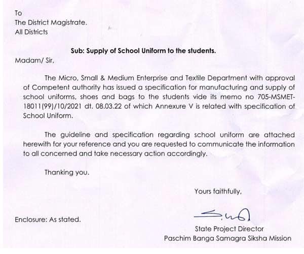 চলতি মাসের শুরুতে মুখ্যসচিবের উপস্থিতিতে নবান্নে একটি উচ্চপর্যায়ের বৈঠক হয়। সেখানে সিদ্ধান্ত হয় এমএসএমই দফতরই (WB School Dress) পোশাকের পাশাপাশি জুতো এবং স্কুল ব্যাগও পাঠাবে। এ যাবৎ এই তিনটি সামগ্রীই স্কুল থেকে বিনামূল্যে পায় ছাত্রছাত্রীরা। তবে পোশাকের নীল-সাদা রং এবং লোগো এবার নতুন সংযোজন। স্কুল শিক্ষা দফতর জেলাশাসকদের চিঠি পাঠিয়ে বিষয়টি জানিয়ে দিয়েছেন।
