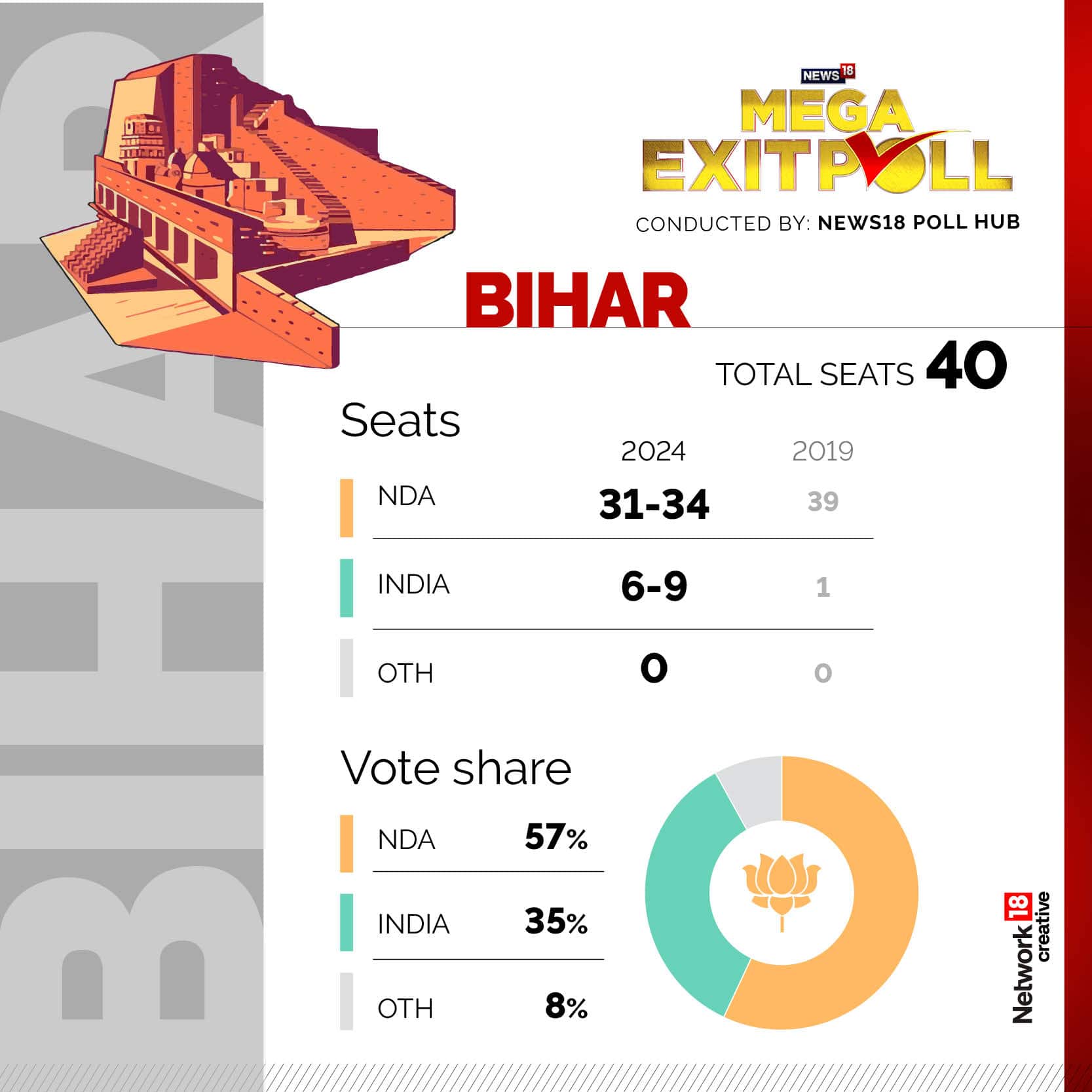 বুথ ফেরত সমীক্ষার ফলাফলে ঝাড়খণ্ডে ১৪টি আসনের মধ্যে এনডিএ জোট পেতে পারে ৯-১২টি আসন ৷ এবং ইন্ডিয়া জোট পেতে পারে ২-৫টি আসন ৷ এর পাশাপাশি বিহারে মোট ৪০টি আসনের মধ্যে এনডিএ জোট পেতে পারে ৩১-৩৪টি আসন ৷ এবং ইন্ডিয়া জোট পেতে পারে ৬-৯টি আসন ৷