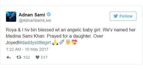 ট্যুইটে আদনান লিখলেন, ‘রোয়া আর আমার জীবনে ঈশ্বরের আর্শীবাদ হিসেবে এসেছে ছোট্ট পরী ৷ মা ও মেয়ে দু’জনেই ভালো আছে ৷ মেয়ের নাম আমরা রেখেছি মেদিনা সামি খান ৷ এই আনন্দ বলে বোঝানো যাবে না ৷’