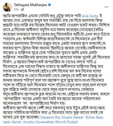 অভিনেতা আরও লিখেছেন, "অনীকদাকে কাজের ও ব্যক্তিগত সূত্রে চেনা পরিচয়ের সুবাদে জানি ওনার একটা ব্যক্তিগত সত্যজিৎময় জগতের কথা, যে জগতের দরজা খুলেই এই সিনেমার নির্মাণ, এ আমার বিশ্বাস। তাই অপরাজিত না দেখেও বলতে পারি এ সিনেমাতে এক ধরনের বিশ্বাস থাকবে যা অনীকদার ব্যক্তিগত কিন্তু তার সততা আপনাকে নিশ্চয়ই ছোঁবে। বেশি সিনেমা হল কম সিনেমা হলের সমীকরণ নিয়ে না ভেবে সিনেমাটা দেখে ফেলুন, যে কটি হল রয়েছে তা কানায় কানায় পরিপূর্ণ হলে সব আক্ষেপ ধুয়ে মুছে যাবে। বাংলা সিনেমার পাশে না দাঁড়িয়ে ভাল সিনেমার পাশে দাঁড়ান, দেখুন,কথা বলুন,ভাল লাগলে বুক বাজিয়ে দশটা লোককে যেতে বলুন,খারাপ লাগলেও সোচ্চারে বলুন,অনীকদা আপনকে ব্লক করবেন না।"