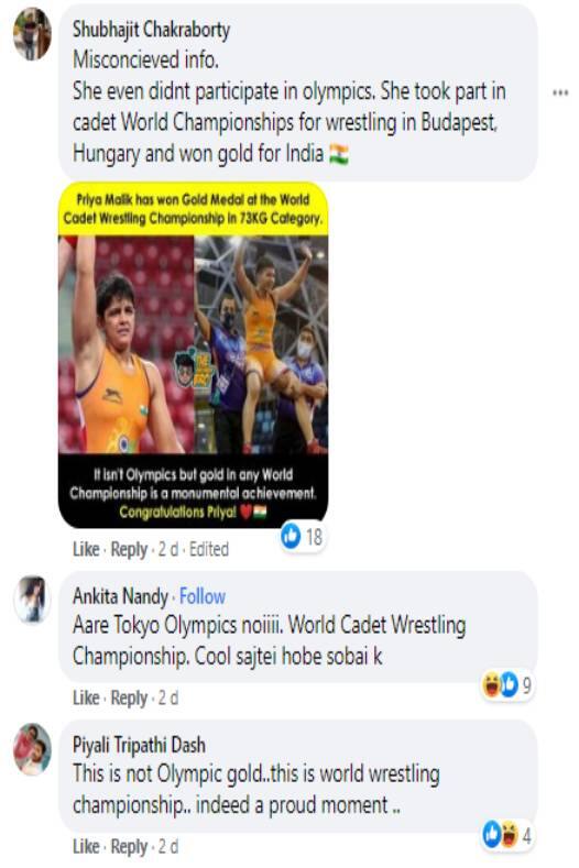 এরপরেইই তাঁর পোস্টের নীচে কমেন্টের বন্যা বয়ে যায়। একজন লিখেছেন, সম্পূর্ণ ভুল তথ্য। তিনি (পড়ুন প্রিয়া মালিক) অলিম্পিক্সে অংশগ্রহণ করেননি। তিনি বিশ্ব কুস্তি চম্পিয়নশিপে অংশ নিয়েছিলেন। যেটা হাঙ্গেরিতে অনুষ্ঠিত হয়। এবং তাতেই তিনি সোনা জেতেন। অন্য একজন লিখেছেন, “প্রিয়া, তোমাকে শুভেচ্ছা। তবে অর্পিতা এটা টোকিও না, এটা বুডাপেস্ট। এটা অলিম্পিক নয়, এটা বিশ্ব কুস্তি চ্যাম্পিয়নশিপ।” অর্পিতা এতটাই ট্রোলড হন যে একঘণ্টার মধ্যে তাঁর ওই পোস্টে প্রায় ২৫০টি কমেন্ট পড়ে যায়। পরে অবশ্য নিজের ওই পোস্ট এডিট করেছেন অভিনেত্রী অর্পিতা।