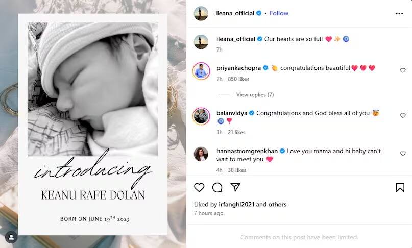 ইলিয়ানা ডি’ক্রুজ তার দ্বিতীয় ছেলের নাম রেখেছেন ‘কিয়ানু রাফে ডোলান’। কিয়ানুর ছবিতে লেখা আছে, ‘কিয়ানু রাফে দোলানের সঙ্গে পরিচয়। জন্ম ১৯ জুন ২০২৫।’ এই পোস্টের ক্যাপশনে লেখা ছিল, ‘আমাদের হৃদয় আনন্দে ভরে গেছে।’ ক্যাপশনে তিনি একটি হৃদয় এবং দুষ্ট চোখের ইমোজিও অন্তর্ভুক্ত করেছেন।