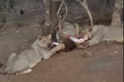 কয়েকটি সিংহ একটি গরু শিকার করে ছিঁড়ে মাংস খেতে ব্যস্ত৷ একেবারে কুকুরের মতো লাঠি নিয়ে সিংহগুলিকে তাড়াচ্ছেন গ্রামের মানুষ৷ এই ভিডিওটি ফেসবুক-এ শেয়ার করেছেন মেগাস্টার অমিতাভ বচ্চন৷ ভিডিও-টি গুজরাতের গির এলাকার৷