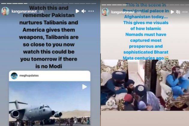 আফগানিস্তানের ঘটনা নিয়ে ইনস্টাগ্রাম স্টোরিতে একাধিক পোস্ট করলেন কঙ্গনা। একটি স্টোরিতে দেখা যাচ্ছে, প্রাণে বাঁচার জন্য কাতারে কাতারে আফগান মানুষ একটি বিমানে ওঠার চেষ্টা করছেন। সঙ্গে কঙ্গনা লিখেছেন, "এটা দেখুন আর মনে রাখবেন এই তালিবানিদের পুষ্ট করে পাকিস্তান আর আমেরিকা এদের অস্ত্র দেয়। তালিবানিরা এখন আপনার অনেক কাছে। এটা দেখুন। আগামীতে মোদি না থাকলে আপনিও এই জায়গায় থাকতে পারেন।"