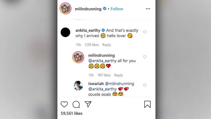 সেই বছরই, ৩০ আগস্ট জন্ম স্ত্রী অঙ্কিতার। অর্থাৎ মিলিন্দ যখন ছবিটা তোলেন তখন তাঁর স্ত্রীর সবে যন্ম হয়েছে আর তাঁর বয়স ২৬। সোশ্যাল মিডিয়ায় শেয়ার হওয়ার পর, ছবিটায় কমেন্ট, লাইক-এর ঝড় ওঠে। সবথেকে নজর কাড়ে স্ত্রী অঙ্কিতার কমেন্ট। তিনি লেখেন, ‘এই জন্যেই আমি এসেছিলাম.... হ্যালো লাভার’। উত্তরে মিলিন্দ লেখেন , 'সব তোমারই জন্যে’।