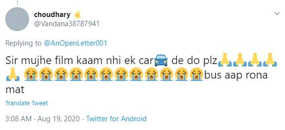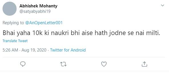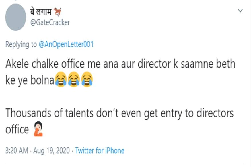 Because, she is "saif ali khan ki beti" Thousands of normal kids beg for roles, get rejected and ignored. Clapping on these stupid stories is how we have normalized nepotism. pic.twitter.com/Iavg2WT6eP — An Open Letter (@AnOpenLetter001) August 19, 2020