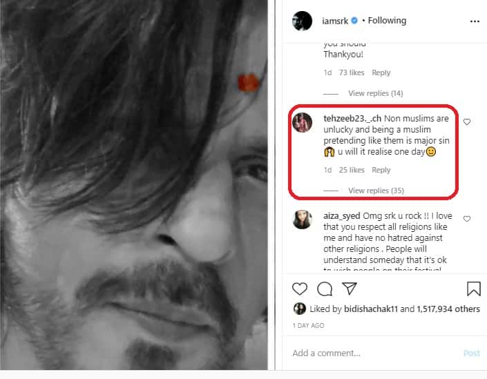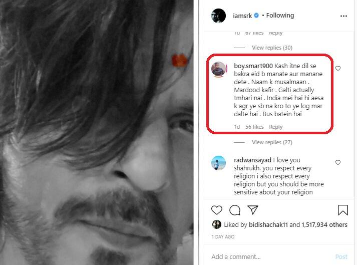 সম্প্রতি শাহরুখের পোস্টে যেমনটা দেখা গেল। গণপতি পুজোয় মঙ্গল টিকা কপালে পরে নিজের একটি ছবি পোস্ট করেছিলেন বাদশাহ । সকলের জন্য শুভ কামনা আর শুভেচ্ছাবার্তা লিখেছিলেন তাতে । এতেই ব্যাপক ট্রলোড হতে হল তাঁকে । মুসলমান হয়েও হিন্দু ধর্মের উৎসব পালন করার জন্য নেটিজেনরা এক হাত নেন কিং খানকে ।