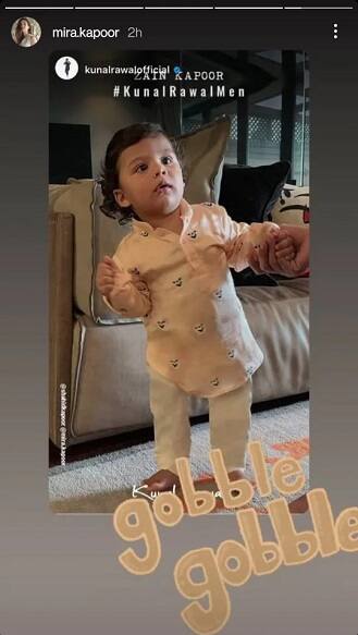 #মুম্বই: বয়স মাত্র ২, তাতে কি। এখন থেকেই ব়্যাম্পের জন্য প্রস্তুত হচ্ছেশাহিদ পুত্র জেইন কাপুর (Zain Kapoor )। শাহিদ কাপুর (Shahid Kapoor) ও মীরা রাজপুতের (Mira Rajput) ছেলে জেইন-এর একটি ছবি মন কেড়েছে নেটাগরিকদের। সম্প্রতি Instagram Story-তে ট্রেডিশনাল পোশাকে দেখা গিয়েছে বেবি বয়-কে। দুই বছরের জেইন-কে সাদা রঙের পায়জামার সঙ্গে প্যাস্টেল রঙের কুর্তা পরে থাকতে দেখা গিয়েছে। তার এই পোশাকের ডিজাইনার কুনাল রাওয়াল (Kunal Rawal)। ছবিটি মূলত তাঁরই Instagram Story-তে দেখা গিয়েছে। পরে মীরা একটি স্টিকার লাগিয়ে নিজের স্টোরিতে ছবিটি শেয়ার করেছেন তাতে লেখা রয়েছে "Gobble gobble"।