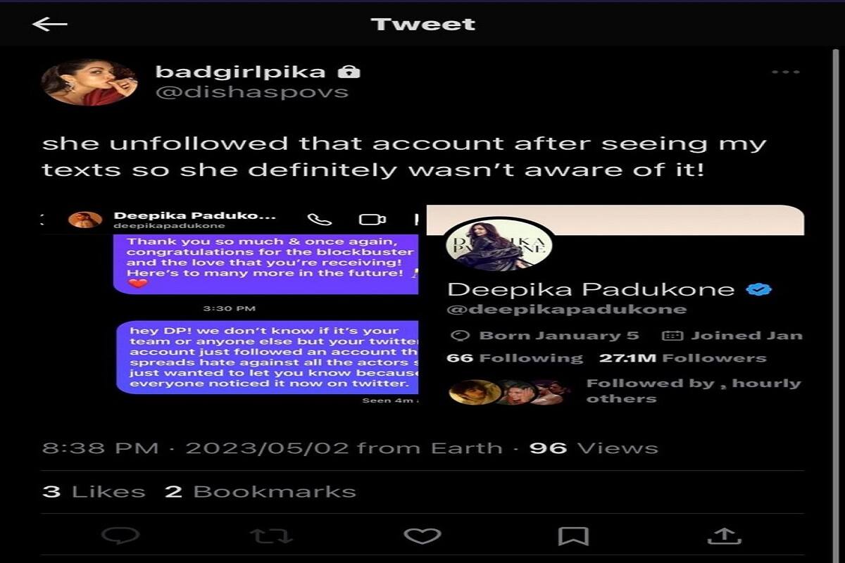 পরে অবশ্য নিজের থেকেই অ্যাকাউন্টটিকে আনফলো করেন দীপিকা। @dishaspovs নামে এক হ্যান্ডেলের ম্যাসেজ পড়েই পেজটি আনফলো করেছেন দীপিকা এমনও দাবি করা হয় সামাজিক মাধ্যমে। ট্যুইটারে ছড়িয়ে পড়েছে সেই ছবিও। @dishaspovs হ্যান্ডেল থেকে দাবি করা হয়েছে যে দীপিকাকে ঘটনাটি জানানোর পরেই ওই অ্যাকাউন্টটি আনফলো করেছেন অভিনেত্রী।