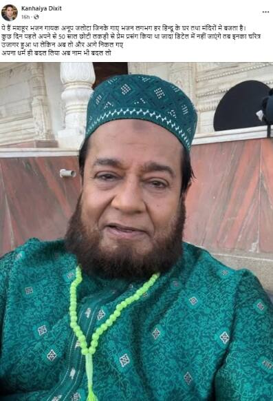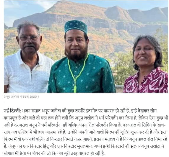 নয়াদিল্লি: ভজন গায়ক অনুপ জালোটার একটি ছবি সোশ্যাল মিডিয়ায় ভাইরাল হচ্ছে। যেখানে তাকে সবুজ কুর্তা এবং টুপি পরা দেখা যাচ্ছে। এই দেখে কিছু নেটিজেন বলছেন এবং দাবি করছেন যে অনুপ জালোটা ইসলাম ধর্ম গ্রহণ করেছেন।