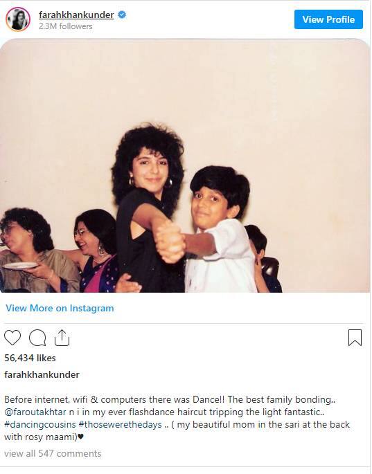 মাসতুতো ভাই ফরহান আখতারের সঙ্গে ছোটবেলার ছবিও শেয়ার করেছেন ফরাহ ৷ সেখানে তিনি কোঁকড়া চুলের কিশোরী ৷ ভাইয়ের সঙ্গে নাচছেন ঘরোয়া অনুষ্ঠানে ৷