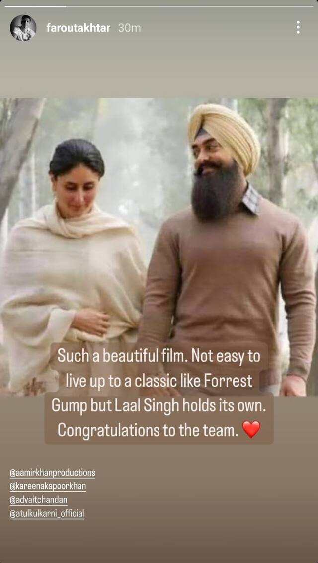 ইনস্টাগ্রাম স্টোরিতে ফারহান আখতার লাল সিং চাড্ডার একটি পোস্টার শেয়ার করেছেন যাতে আমির খান এবং কারিনা কাপুর খান রয়েছে। পোস্টারটি শেয়ার করে তিনি লিখেছেন, “এত সুন্দর একটি ছবি। ফরেস্ট গাম্পের মতো ক্লাসিকের মতো বেঁচে থাকা সহজ নয় কিন্তু লাল সিং তাঁর নিজের মতো করেই সুন্দর। দলকে অভিনন্দন।”