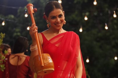 Genelia D'Souza: গানটিতে লিপ দিয়েছেন জেনেলিয়া। হাতে একতারা। লাল-সাদা লেহঙ্গায় নজর কেড়েছেন অভিনেত্রী।