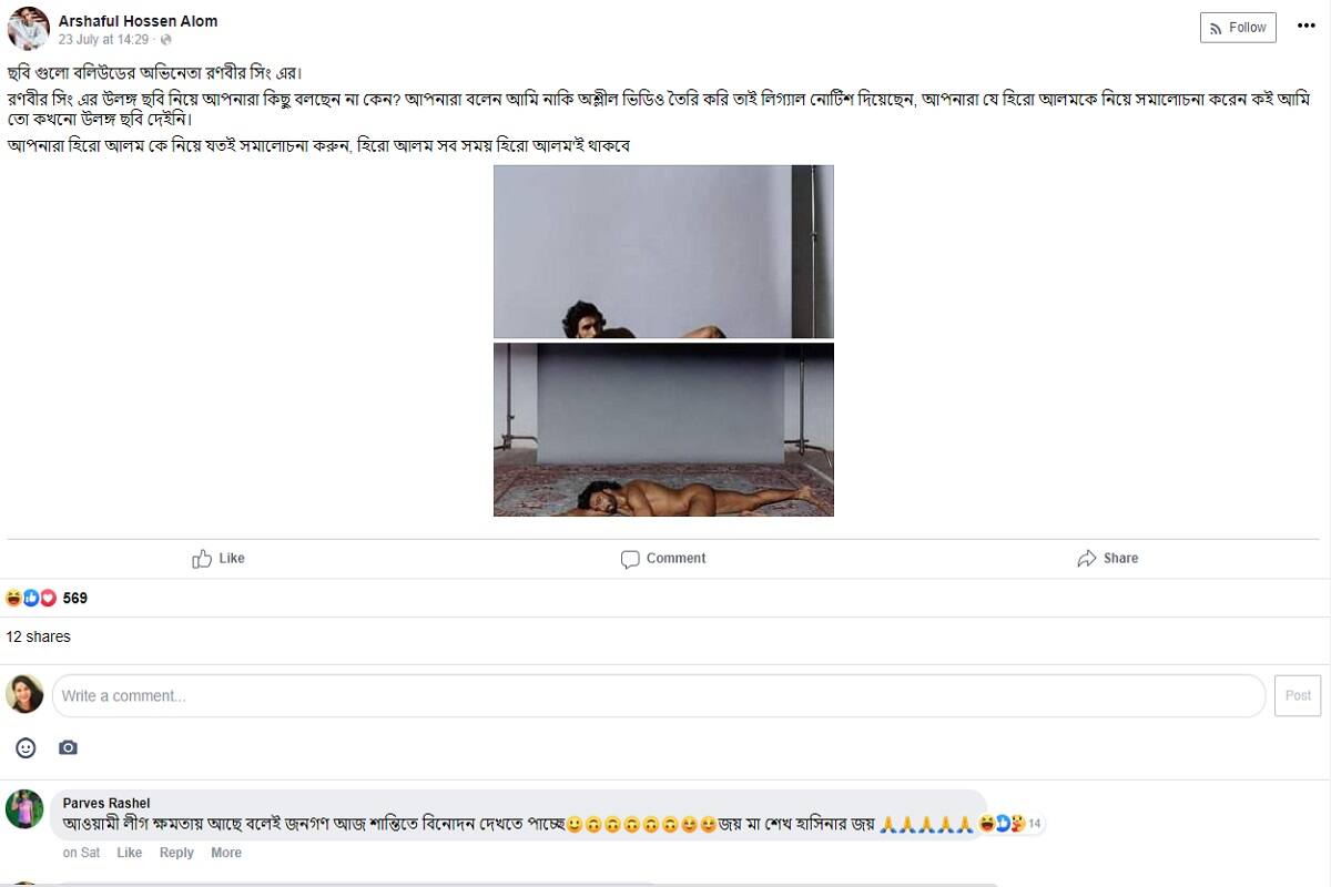 যখন আলোচনা-সমালোচনা তুঙ্গে, ঠিক সে সময়ে বিষয়টি নিয়ে নিজের ফেসবুক আইডিতে পোস্ট করলেন হিরো আলম। রণবীরের সেই ছবি পোস্ট করে সরব হন বাংলাদেশি অভিনেতা-ইউটিউবার। সেখানে তিনি বলেন, রণবীর সিং-এর উলঙ্গ ছবি নিয়ে আপনারা কিছু বলছেন না কেন? আপনারা বলেন আমি নাকি অশ্লীল ভিডিও তৈরি করি তাই লিগ্যাল নোটিশ দিয়েছেন, আপনারা যে হিরো আলমকে নিয়ে সমালোচনা করেন কই আমি তো কখনও উলঙ্গ ছবি দিইনি। আপনারা হিরো আলমকে নিয়ে যতই সমালোচনা করুন, হিরো আলম সবসময় হিরো আলমই থাকবে।
