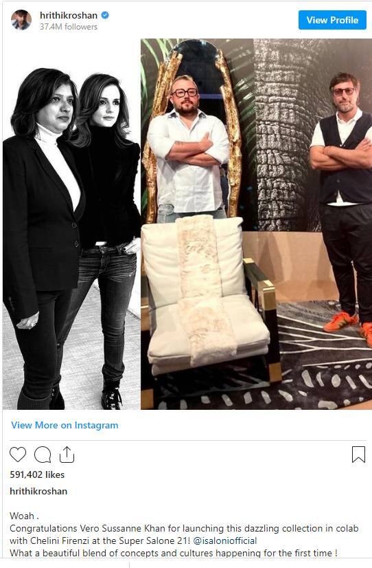 সুজানের ছবি শেয়ার করে হৃতিক লিখেছেন, ‘‘সুপার সালোঁ ২১-এ শেলিনি ফিরেনজি-র সঙ্গে সহযোগিতায় এই চোখ ধাঁধাঁনো সংগ্রহের জন্য সুজান খানকে অভিনন্দন! প্রথম বারের জন্য সংস্কৃতি ও বিষয়ের মধ্যে কী সুন্দর মেলবন্ধন হয়েছে ৷’’ প্রাক্তন জীবনসঙ্গীকে পাল্টা ধন্যবাদ জানিয়েছেন সুজানও ৷ মন্তব্য বাক্সে একাধিকবার ‘ধন্যবাদ’ লিখেছেন তিনি ৷ সঙ্গে রয়েছে একাধিক ইমোজি ৷
