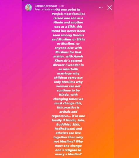 কঙ্গনা লিখেছেন “ আমির খানের দ্বিতীয় বিবাহবিচ্ছেদ নিযে আমার কিছু প্রশ্ন আছে৷ আমি ভাবছি, ভিন ধর্মে বিয়ে হলে সন্তানরা কেন শুধুই মুসলিম ধর্মেরই পরিচিতি পায়? কেন বিয়ের পরও মহিলারা হিন্দুই থেকে যেতে পারেন না? সময়ে অগ্রগতির সঙ্গে আমাদের এটা পরিবর্তন করে হবে। এই রীতি প্রাচীন ও অনগ্রসর ৷ যদি একই পরিবারের সদস্যদের মধ্যে হিন্দু, জৈন, বৌদ্ধ, শিখ ও অন্য ধর্মাবলম্বীরা মিলেমিশে থাকতে পারেন, তা হলে মুসলিমরা কেন পরবেন না?’’ প্রশ্ন কঙ্গনার ৷ এই প্রসঙ্গে তিনি উল্লেখ করেছেন পঞ্জাবের একটি পুরনো রীতি, যেখানে একই পরিবারের দুই পুত্রসন্তানকে হিন্দু ও শিখ ধর্মে দীক্ষিত করে একসঙ্গে বড় করা হত ৷