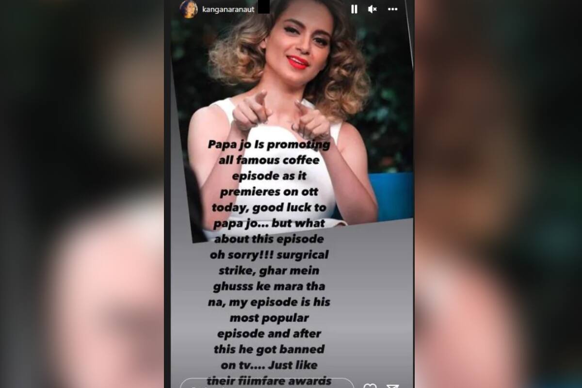 চ্যাট শো শুরু হওয়ার দিন কঙ্গনা মন্ত্রী করে বসলেন করণকে নিয়ে। করণ একের পর এক পুরনো পর্বগুলি সোশ্যাল মিডিয়ায় শেয়ার করছেন দেখে কঙ্গনার প্রশ্ন জেগেছে, তিনি যে পর্বে ছিলেন, সেটি কেন শেয়ার করছেন না, তাই ইনস্টাগ্রাম স্টোরিতে 'ক্যুইন' লিখলেন, 'পাপা জো-কে (করণ জোহরকে যে যে নামে ডাকেন, তার একটি) শুভেচ্ছা। ওটিটি-তে আজ শো শুরু হওয়ার আগে পাপা জো সমস্ত পুরনো কফি পর্বগুলিকে শেয়ার করে প্রচার করছে। কিন্তু সেই এপিসোডটা কই? ওহ, তাই তো! সার্জিক্যাল স্ট্রাইক করেছিলাম যে। ঘরে ঢুকে মেরেছিলাম না! আমার এপিসোড সবথেকে জনপ্রিয় হয়েছিল। তার পরেই তো টেলিভিশন থেকে বার করে দেওয়া হল।'