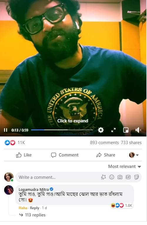 সকলের বাহবার মাঝখানে ভেসে উঠল একটি মন্তব্য—‘তুমি গাও, তুমি গাও।আমি মাছের ঝোল আর ভাত রাঁধলাম গো।’ লিখেছেন আর কেউ নন, তাঁর স্ত্রী, লোপামুদ্রা মিত্র ৷ লেখার সঙ্গে ভালবেসে দিয়েছেন একটি প্রেমের ইমোজিও ৷ যার দু’চোখে ফুটে উঠছে ভালবাসার পানপাতা ৷ সামাজিক মাধ্যমে এই তারকা স্বামী স্ত্রী জুটির যুগলবন্দি এখন সুপারহিট ৷ গত দু’দিনে লোপামুদ্রার মন্তব্যে ‘লাইক’ পড়েছে ১৮০০-র বেশি ৷ সঙ্গীতশিল্পীর সুরসিক মন্তব্যের প্রেক্ষিতে এসেছে অসংখ্য পাল্টা মন্তব্য ৷