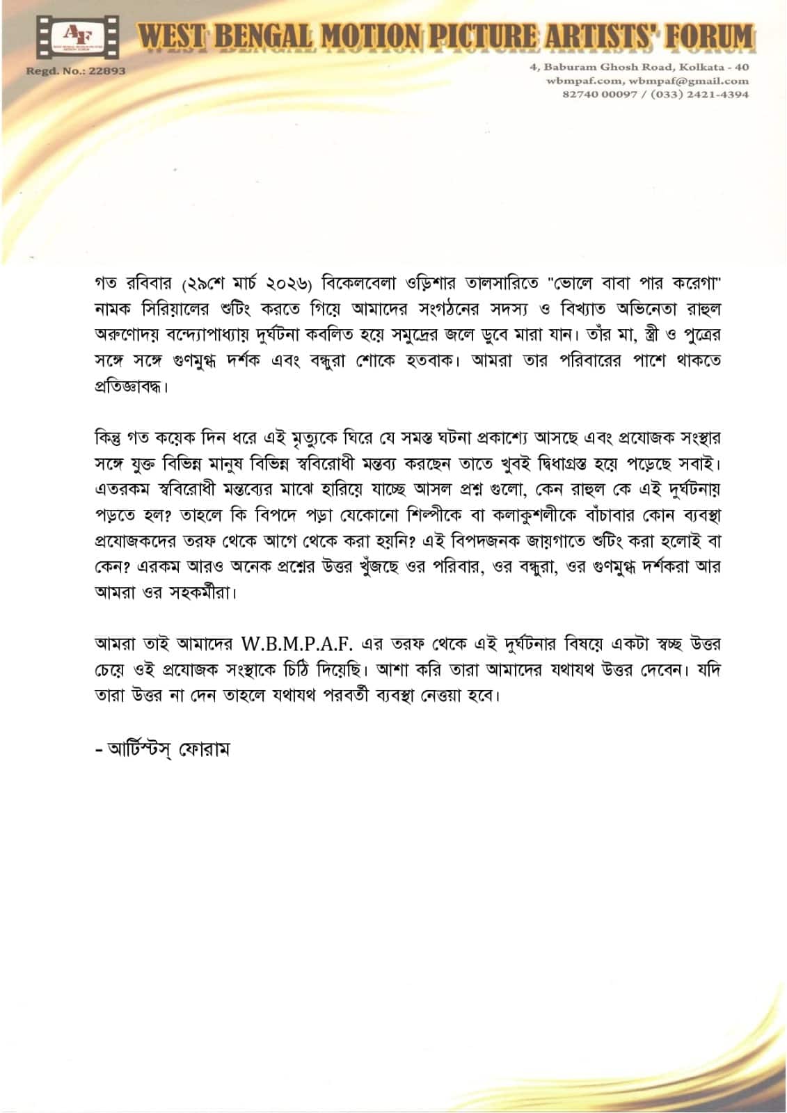 Rahul Arunoday Banerjee: রাহুলের মৃত্যুর যথাযথ কারণ কী? আর্টিস্ট ফোরামের তরফ থেকে চিঠি প্রযোজনা সংস্থা 'ম্যাজিক মোমেন্টস'কে