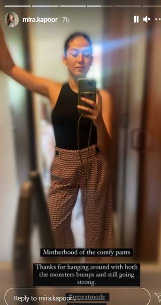 ইনস্টাগ্রাম স্টোরিতে একটি ছবি শেয়ার করেছেন মীরা (Mira Kapoor) ৷ সেখানে তিনি কালো ট্যাঙ্ক টপ এবং চেক পালাজ্জো পরে আছেন ৷ অন্তঃসত্ত্বা থাকার সময় এই ধরনের ঢিলেঢালা পোশাকে আরামে থাকা যায় ৷ মনে করা হচ্ছে, দুই সন্তানের জন্মের আগেই মীরা এই পোশাক পরে দিন কাটিয়েছেন ৷