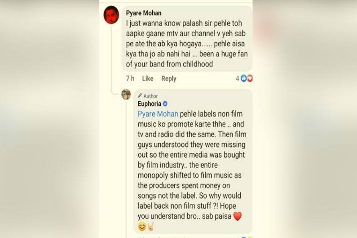 দীর্ঘ উত্তরে স্পষ্টতই পরিষ্কার ছিল পলাশ সেনের ক্ষোভ। সরাসরি ফিল্ম ইন্ডাস্ট্রির মিডিয়া কিনে নেওয়ার অভিযোগ তোলেন তিনি। পলাশ তাঁর কমেন্টে যোগ করেন, “প্রযোজকরা ছবির গানের পিছনে টাকা ঢালতেন। লেবেলের জন্য নয়। তাই লেবেল কেন ছবির বাইরের গানের পাশে থাকবে? আশা করছি কী বলতে চাইছি বুঝতে পারছেন। সবটাই পয়সা…”। ফিল্ম ইন্ডাস্ট্রি এমনকি মিউজিক ইন্ডাস্ট্রির এই মনোপলি বা একচেটিয়া ব্যবসার অভিযোগ আগেও ভিতর থেকেই উঠেছে। সরব হয়েছেন সোনু নিগম সহ নামজাদা সঙ্গীতশিল্পীরাও। এ বার মুখ খুললেন পলাশ সেনও।