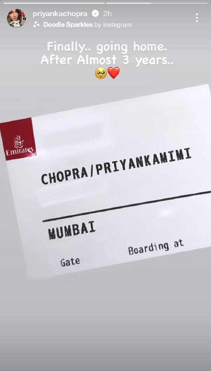 ইনস্টাগ্রাম স্টোরিতে প্রিয়াঙ্কা তাঁর বোর্ডিং পাসের ছবি শেয়ার করেছেন, যেখানে লেখা রয়েছে তিনি মুম্বই ফিরছেন। ক্য়াপশনে তিনি লিখেছেন, "অবশেষে... বাড়ি ফিরছি... প্রায় 3 বছর পর..."
