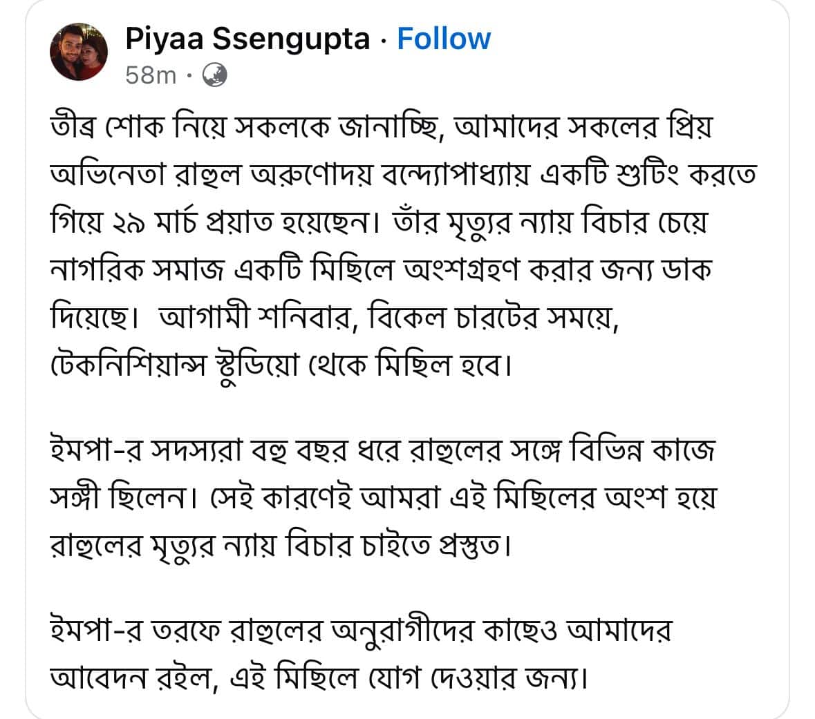 সোশ্যাল মিডিয়ায় একটি পোস্টে তিনি লেখেন-তীব্র শোক নিয়ে সকলকে জানাচ্ছি, আমাদের সকলের প্রিয় অভিনেতা রাহুল অরুণোদয় বন্দ্যোপাধ্যায় একটি শুটিং করতে গিয়ে ২৯ মার্চ প্রয়াত হয়েছেন। তাঁর মৃত্যুর ন্যায় বিচার চেয়ে নাগরিক সমাজ একটি মিছিলে অংশগ্রহণ করার জন্য ডাক দিয়েছে। আগামী শনিবার, বিকেল চারটের সময়ে, টেকনিশিয়ান্স স্টুডিও থেকে মিছিল হবে।
