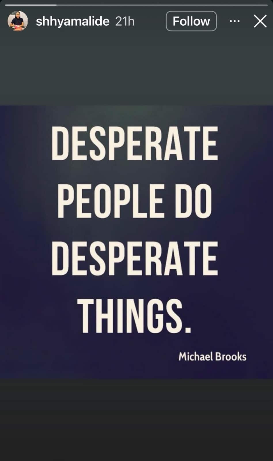 রবিবার রাতে শ্যামলী একটি ইনস্টাগ্রাম স্টোরি শেয়ার করেছেন যেখানে লেখা ছিল, “ডেসপারেট পিপল ডু ডেসপারেট থিংস”। স্বাভাবিক ভাবেই এই পোস্ট আলোচনার জন্ম দিয়েছে, অনেক সোশ্যাল মিডিয়া ইউজার এটা সামান্থা এবং রাজের বিয়ে নিয়ে কটাক্ষ বলে মনে করছেন।