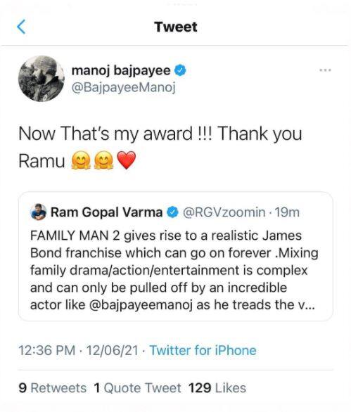 The Family Man Season 2 -এর প্রশংসায় মেতেছেন অনেকেই। আজ ট্যুইটারে ট্যুইট করে প্রশংসা করেছেন পরিচালক রাম গোপাল ভার্মা।