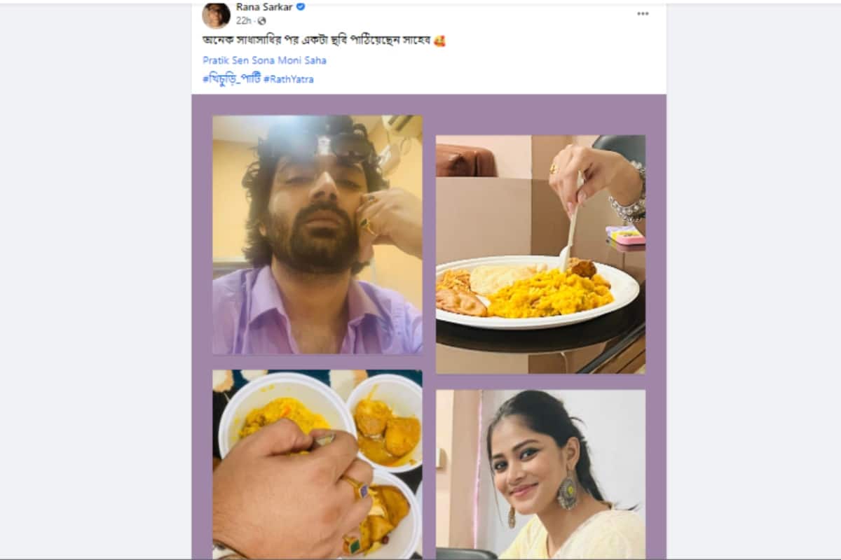 রানা শনিবার চারটি ছবি পোস্ট করেছেন ফেসবুকে। যেখানে শঙ্খ এবং মোহরের আলাদা আলাদা ছবি রয়েছে। এবং খিচুড়ি ভোগ খাওয়ার ছবি। এক মহিলা এবং পুরুষের হাতও রয়েছে তার সঙ্গে। রানাকে যোগাযোগ করা হলে তিনি জানান, এই ছবি তাঁর অফিসের রথযাত্রার অনুষ্ঠানের ছবি। যেখানে সোনামণি উপস্থিত ছিলেন। কিন্তু শ্যুটিংয়ে ব্যস্ততার কারণে প্রতীক অনুষ্ঠানে যেতে পারেননি। কিন্তু রানা তাঁর জন্য আলাদা করে খিচুড়ি পাঠিয়েছিলেন সেটে। সেই খিচুড়ি খাওয়ার ছবি রানাকে পাঠিয়েছিলেন প্রতীক। সোনামণির ছবির সঙ্গে প্রতীকের হাতের ছবি দিয়েছিলেন ফেসবুকে। কিন্তু তাতে খুশি নন ভক্তরা। প্রতীকের ছবি দেখতে চেয়েছিলেন সবাই। ভক্তদের অনুরোধ রাখতে সেট থেকেই নিজের ছবি পাঠান প্রতীক। তার পরে সেই সব জুড়ে একসঙ্গে পোস্ট করেন রানা। লেখেন, 'অনেক সাধাসাধির পর একটা ছবি পাঠিয়েছেন সাহেব।'