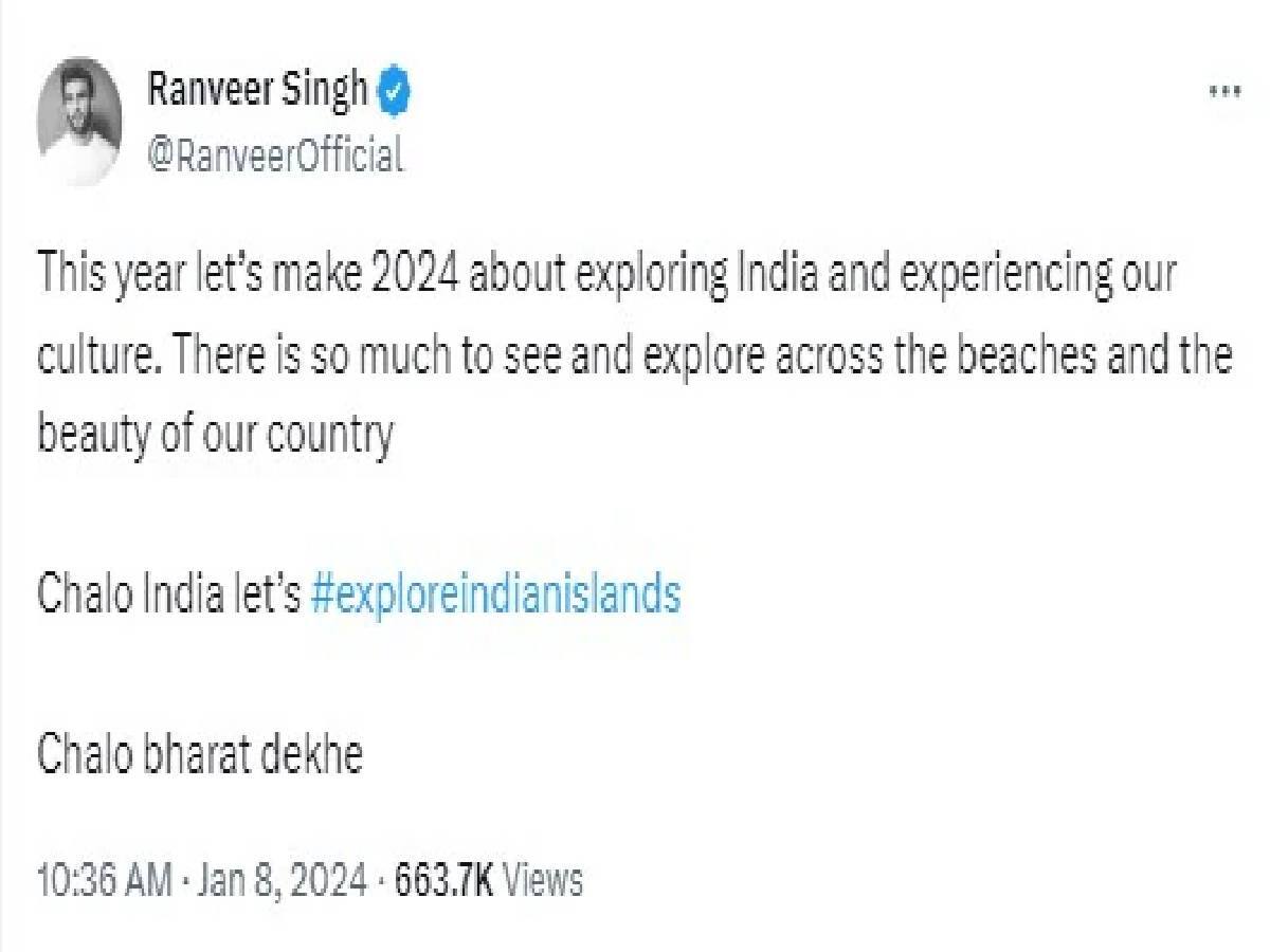 রণবীর তাঁর ভুল সংশোধন করে আবার পোস্ট করেছেন তিনি। এবার শুধু ক্যাপশন-সহ আরেকটি পোস্ট করেছেন, ‘এই বছর ২০২৪ সালে চলুন ভারত ঘুরে দেখা যাক। আমাদের সংস্কৃতির অভিজ্ঞতা নিয়েই ২০২৪-কে তৈরি করা যাক। সমুদ্র সৈকত জুড়ে কত কী দেখার রয়েছে। আমাদের দেশের সৌন্দর্যের অঢেল ভাণ্ডার। আসুন ভারতের সৈকতগুলি ঘুরে দেখা যাক। ‘এক্সপ্লোর ইন্ডিয়ান আইল্যান্ডস’। চলো ভারত ঘুরে দেখা যাক। ’