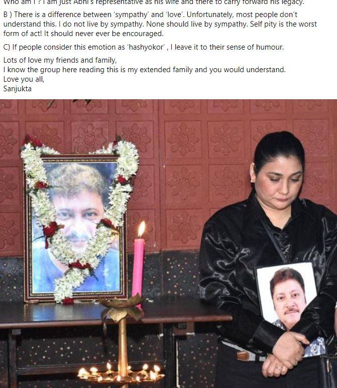 কিছু নেটিজেনের মনে হয়েছে এই যে সংযুক্তা সব সময় স্বামীর ছবি হাতে সর্বত্র যাচ্ছেন, তাঁর সেই আচরণ ‘হাস্যকর’ ৷ সমালোচনার জবাব দিতে তিনি বাধ্য নন ৷ এ কথাও জানান সংযুক্তা ৷ তবে যেহেতু এর সঙ্গে তাঁর স্বামীর নাম জড়িয়ে আছে., তাই তিনি উত্তর দেওয়ার সিদ্ধান্ত নেন ৷ পোস্টের প্রথমেই সংযুক্তার প্রশ্ন, তিনি কেন সহানুভূতি কুড়োতে যাবেন? তিনি এক জন স্বাধীন উপার্জনশীল নারী ৷ গত ২৪ মার্চের পর থেকে অভিষেকের আশীর্বাদ নিয়ে একাই সামলাচ্ছেন ঘরে বাইরে ৷ লিখেছেন, প্রত্যেক পরিবারেই মৃত্যুর অভিজ্ঞতা আসে ৷ কে কীভাবে এই যন্ত্রণার মুখোমুখি হবেন, সেটা তাঁর উপরই নির্ভর করে ৷ তিনি নিজের শক্তির অংশ করে নিয়েছেন অভিষেককে ৷ প্রয়াত স্বামীর সঙ্গেই এগিয়ে যেতে ভালবাসেন ৷