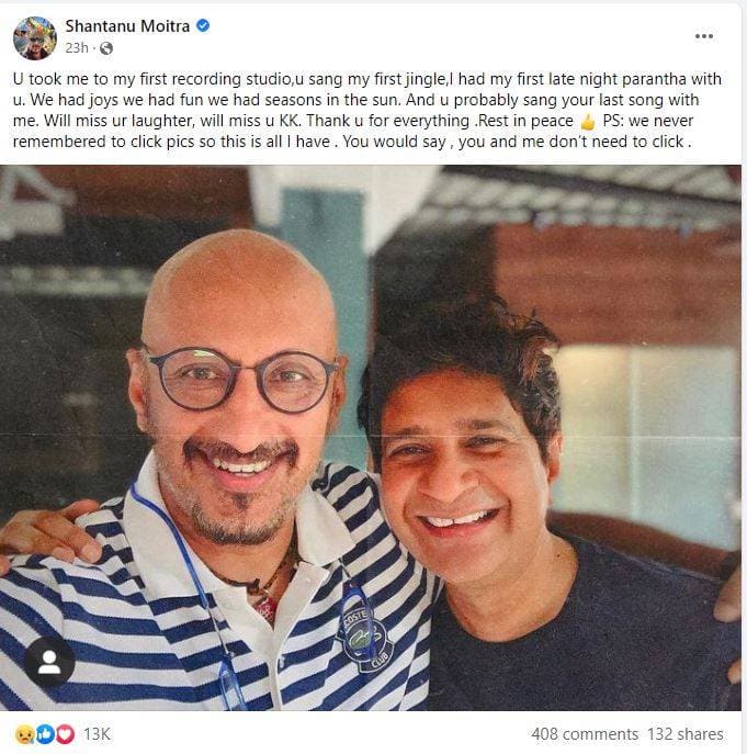 শান্তনুর মনে পড়ছে সেনা ঝরা ঝলমলে দিনগুলোতে তাঁরা কেমন আনন্দ করতেন৷ কতটা মজা ছিল তাঁদের জীবনে৷ সম্ভবত শান্তনুর সুরেই শেষ গান গেয়েছেন কেকে৷ সেকথাও লিখেছেন সুরকার৷ ‘‘আমি তোমার হাসি মিস করব৷ তোমাকে মিস করব কেকে৷ সব কিছুর জন্য তোমাকে ধন্যবাদ৷ যেখানেই আছো, শান্তিতে থাকো৷’’ রয়ে গিয়েছে শান্তনুর আফশোসও৷ একসঙ্গে থাকলেও ছবি তোলার কথা মনে থাকত না তাঁদের৷ কেকে-এর সঙ্গে একটিমাত্র ছবিই ছিল শান্তনুর কাছে৷ সেটাই শেয়ার করেছেন তিনি৷ একটামাত্র ছবি? তাতে কী? শান্তনু নিশ্চিত, কেকে থাকলে বলতেন ‘‘তোমার আর আমার ছবি তোলার দরকার নেই৷’’