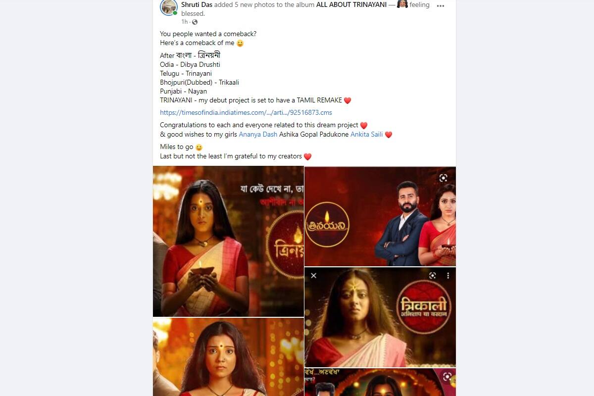 শ্রুতির কথায় জানা গেল, তাঁর প্রথম ধারাবাহিক 'ত্রিনয়নী' এ বারে দক্ষিণে পৌঁছে গেল। এর আগে বাংলা জনপ্রিয় ধারাবাহিকটি ওড়িয়া ভাষায় 'দিব্য দিব্যদ্রূষ্টি', তেলুগুতে 'ত্রিনয়নী', ভোজপুরিতে 'ত্রিকালী' (এটি যদিও বাংলাটিকেই ডাব করে সম্প্রচার করা হয়), পঞ্জাবি ভাষায় 'নয়ন' হিসেবে সম্প্রচারিত হয়েছে। এ বারে তামিল ভাষায় শুরু হচ্ছে এই ধারাবাহিক। নাম রাখা হয়েছে, 'মারি'। শ্রুতি বাংলা ধারাবাহিকের নির্মাতাদের ধন্যবাদ জানালেন এই পোস্টে।