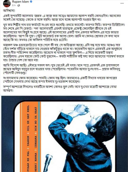 অনেক ছোট থেকেই কেকে-র ভক্ত রূপম। সে কথাও বিস্তারিত লিখতে ভুললেন না তিনি। ‘জন্নত’ ছবির গানে একসঙ্গে গান গেয়েছেন তাঁরা। কিন্তু আলাপ হয়নি দু’জনের। তা বলে কেকে-র গান নিয়ে মাতামাতি কম ছিল না তাঁর। তাই লিখেছেন, ‘খুব কম শিল্পীর গান চার ফর্ম্যাটে সংগ্রহ করে শুনেছি। প্রথমে ক্যাসেট। তারপর সিডি। তারপর ডিজিট্যাল। সব শেষে এল পি রেকর্ড। ‘পল’ অ্যালবামটি এমনই মারাত্মক এফেক্ট ফেলেছিল জীবনে যে ওই অ্যালবামের সব কিছুই সংগ্রহে আছে।’