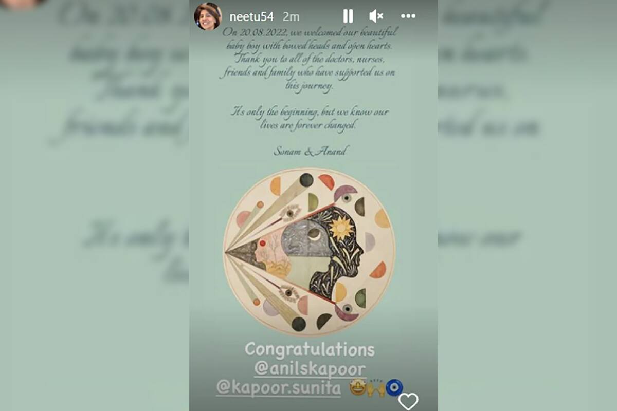 সোনম-আনন্দের তরফে একটি বিবৃতি পোস্ট করা হয়েছে। নীতুর পোস্ট থেকে জানা গেল, সেই বিবৃতিতে লেখা, '২৮ অগাস্ট আমরা অপূর্ব এক পুত্রসন্তানের জন্ম দিলাম। সব চিকিৎসক, নার্স এবং বন্ধু, পরিবারকে অনেক ধন্যবাদ। এ তো কেবল শুরু। কিন্তু জানি, এর পর থেকে আমাদের জীবন সম্পূর্ণ ভাবে বদলে যাবে।'