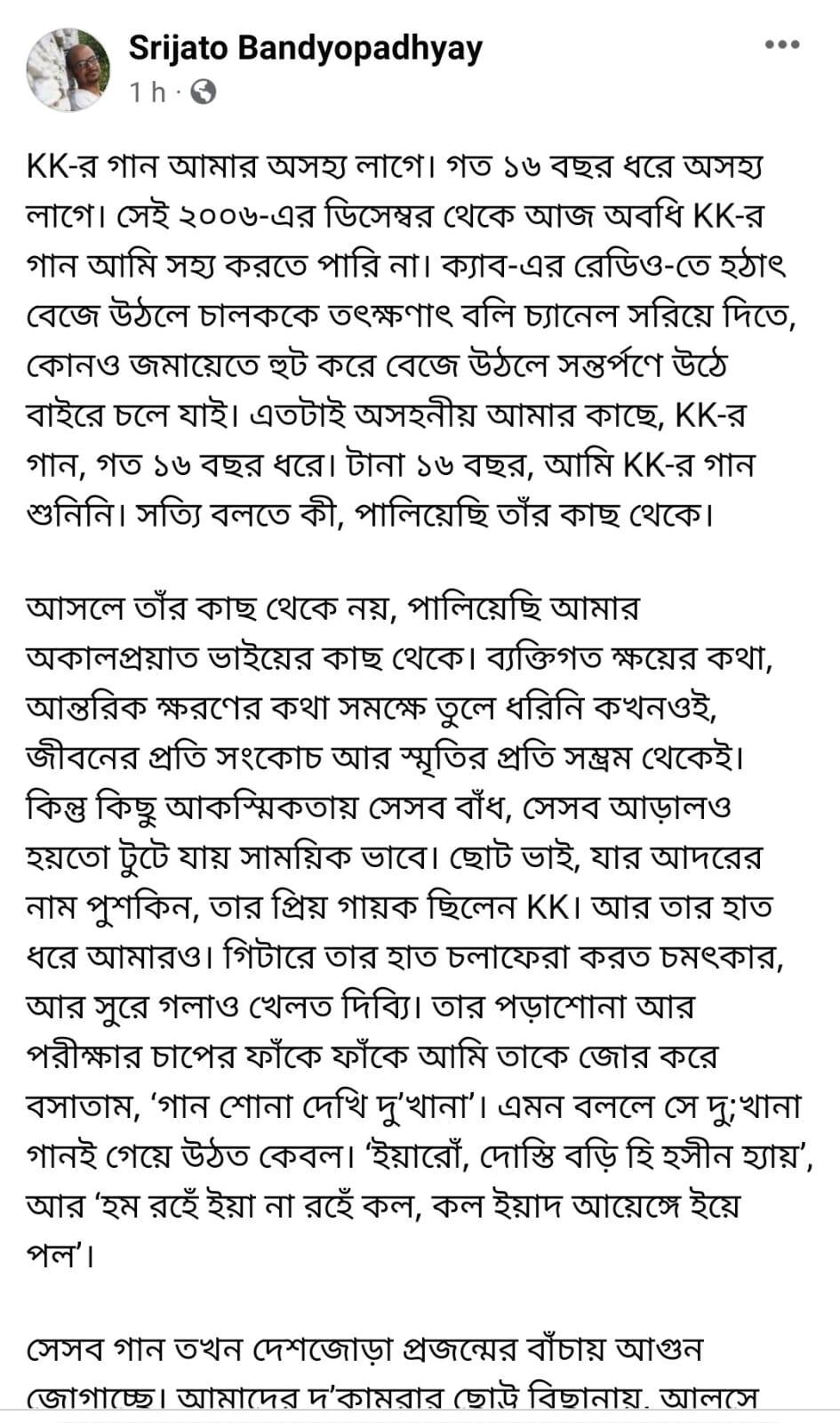 শ্রীজাত তাঁর পোস্টে লিখলেন, ‘KK-র গান আমার অসহ্য লাগে। গত ১৬ বছর ধরে অসহ্য লাগে। সেই ২০০৬-এর ডিসেম্বর থেকে আজ অবধি KK-র গান আমি সহ্য করতে পারি না। ক্যাব-এর রেডিও-তে হঠাৎ বেজে উঠলে চালককে তৎক্ষণাৎ বলি চ্যানেল সরিয়ে দিতে, কোনও জমায়েতে হুট করে বেজে উঠলে সন্তর্পণে উঠে বাইরে চলে যাই। এতটাই অসহনীয় আমার কাছে, KK-র গান, গত ১৬ বছর ধরে। টানা ১৬ বছর, আমি KK-র গান শুনিনি। সত্যি বলতে কী, পালিয়েছি তাঁর কাছ থেকে’।