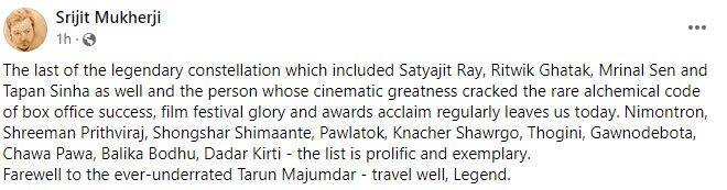 প্রয়াত পরিচালকের অসংখ্য ছবির মধ্যে থেকে সৃজিত উল্লেখ করেছেন ‘নিমন্ত্রণ’, ‘শ্রীমান পৃথ্বীরাজ’, ‘সংসার সীমান্তে’, ‘পলাতক’, ‘কাচের স্বর্গ’, ‘ঠগিনী’, ‘গণদেবতা’, ‘চাওয়া পাওয়া’, ‘বালিকা বধূ’, ‘দাদার কীর্তি’-র কথা ৷ তবে তাঁর যে খ্যাতি ও সম্মান প্রাপ্য ছিল, তা থেকে বঞ্চিত হয়েছেন তরুণ মজুমদার, মত সৃজিতের ৷ শ্রদ্ধার্ঘ্যবার্তার শেষে তিনি লিখেছেন চিরকাল ন্যায্য প্রাপ্য থেকে বঞ্চিত হওয়া তরুণ মজুমদারকে বিদায় ৷ কিংবদন্তির শেষ সফর ভাল হোক ৷