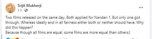 পরিচালক লিখছেন, "দুটি ছবির মুক্তি একই দিনে। দুটি ছবির জন্যই নন্দন ১-এ আবেদন করা হয়েছে। কিন্তু শুধু একটি ছবিই নন্দনে চলার জায়গা পেলো। কিন্তু সঠিক ভাবে দেখতে গেলে দুটিরই জায়গা পাওয়া উচিত। অথবা কোনওটিরই পাওয়া উচিত নয়। এটা কেন হল? কারণ সব ছবিই সমান। কিন্তু কিছু ছবি সমানের থেকও উর্ধ্বে।" সৃজিতের এই পোস্ট মুহূর্তে ভাইরাল হয়। অনেকেই তাঁর সমর্থনে কথা বলেন। আবার কেউ কেউ এই প্রশ্নও তোলেন, 'অপরাজিত'-র সময়ে কেন কিছু বলেননি। তবে কমেন্ট বক্সে অনেকেই আবার জানিয়েছেন, তাঁর অন্য প্রেক্ষাগৃহে ছবিটি দেখতে যাবেন।