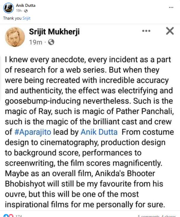 মুক্তির পরই অনীকের ‘অপরাজিত’ সমাদৃত সমালোচক ও দর্শকমহলে৷ মুগ্ধ সৃজিতও৷ সামাজিক মাধ্যমে ছবির উচ্ছ্বসিত প্রশংসা করে তিনি অভিনন্দন ও শুভেচ্ছা জানিয়েছেন অনীক দত্তকে৷
