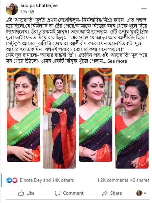 সুদীপা ফেসবুকে লিখেছেন, এই ঝাড়বাতিদুল তিনি প্রথম দেখেছিলেন নির্মলা মিশ্রর কাছে ৷ তখনই পছন্দ হয়েছিল ৷ বুঝতে পেরে শিল্পী তাঁর কান থেকে খুলে দিয়ে দিয়েছিলেন সুদীপাকে ৷ কিন্তু গায়িকার প্রিয় উপহার নিয়ে নিতে চাননি সুদীপা ৷ ফিরিয়ে দিয়েছিলেন ৷ বলেছিলেন, দুলের সঙ্গে আদর আর আশীর্বাদটুকু তিনি নিলেন ৷ সঙ্গে চেয়ে নিয়েছিলেন অগ্রজ শিল্পীর শুভকামনা ৷ যাতে একদিন ওরকম দুল তিনিও পরতে পারেন ৷