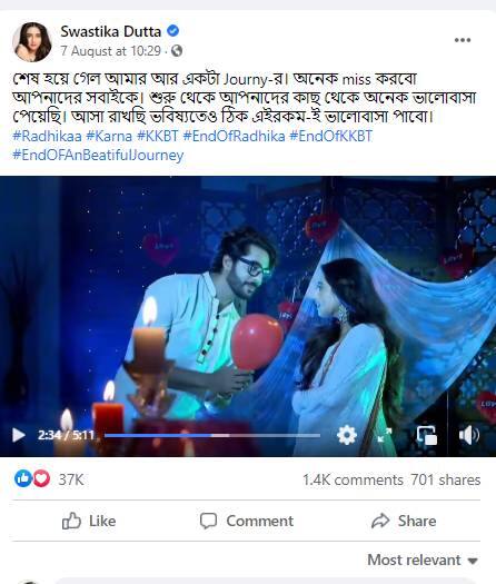 ২৩ জুলাই শেষ হয়ে গিয়েছিল শ্যুটিং ৷ ৭ অগাস্ট সম্প্রচারিত হল ‘কী করে বলব তোমায়’-এর শেষ পর্ব ৷ ধারাবাহিকের ক্লিপিংস শেয়ার করে ক্যাপশনে স্বস্তিকা লিখেছেন, তাঁর আরও একটা যাত্রা শেষ হল ৷ দর্শকদের মিস করবেন তিনি ৷ তাঁর আশা, শুরু থেকে দর্শকদের যে ভালবাসা পেয়েছেন, একই রকম ভাবে তা পাবেন আগামি দিনগুলিতেও ৷