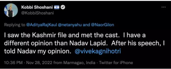 তবে ‘দ্য কাশ্মীর ফাইলস’ ঘিরে সাম্প্রতিক বিতর্কে ল্যাপিডের সম্পূর্ণ বিপরীত মেরুতে অবস্থান করছেন ইজরায়েলের কাউন্সেল জেনারেল কোব্বি শোশানি৷ তিনি ট্যুইট করেছেন ‘‘দ্য কাশ্মীর ফাইলস আমি দেখেছি৷ কুশীলবদের সঙ্গে আলাপও করেছি৷ নাদাভ ল্যাপিডের সঙ্গে আমি সহমত নই৷ তাঁর বক্তব্য শোনার পর আমি নাদাভকে নিজের মতামতও জানিয়েছি৷’’ নিজের ট্যুইটে পরিচালক বিবেক অগ্নিহোত্রীকে ট্যাগও করেন শোশানি৷