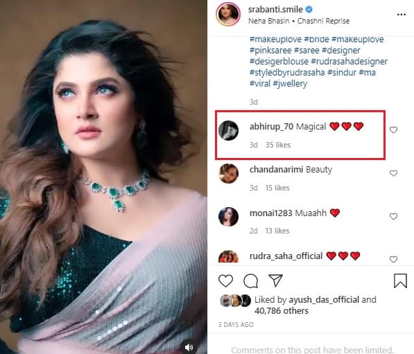 সম্প্রতি শ্রাবন্তীর একটি ফোটোশ্যুটের ভিডিওতে কমেন্টও করেছিলেন অভিরূপ । ইনস্টাগ্রামে দু’জনেই একে অপরকে ফলো করেন। তার উপর শ্রাবন্তীর কমেন্ট বক্স রেস্ট্রিক্টেড । শুধুমাত্র শ্রাবন্তী যাঁদের ফলো করেন সেই ব্যক্তিরাই তাঁর ছবি বা ভিডিওতে কমেন্ট করতে পারবেন এবং সেটাই দেখা যাবে । তাই অভিরূপের কমেন্ট-টিও সহজেই নজরে পড়েছে । ফোটোশ্যুটে দেখা যাচ্ছে, অপরূপা শ্রাবন্তী গোলাপি সিক্যুইনের একটি শাড়ি পরেছেন । সঙ্গে মানানসই সবুজ ব্লাউজ ও ডিজাইনার গয়না । ব্যাকগ্রাউন্ডে বাজছে ‘ইশকে দি চাসনি’ । এই ভিডিও দেখে নিজেকে সামলাতে পারেননি অভিরূপ । লিখেছেন, ‘ম্যাজিক্যাল’ । সঙ্গে এঁকে দেন হৃদয়ের ইমোজিও । আর এই কমেন্ট চোখ এড়ায়নি নেটিজেনদের । টলিউডে ফের আরও একটা নতুন খবর আসার অপেক্ষায় অধীর আগ্রহে অপেক্ষা করে রয়েছেন সকলে ।