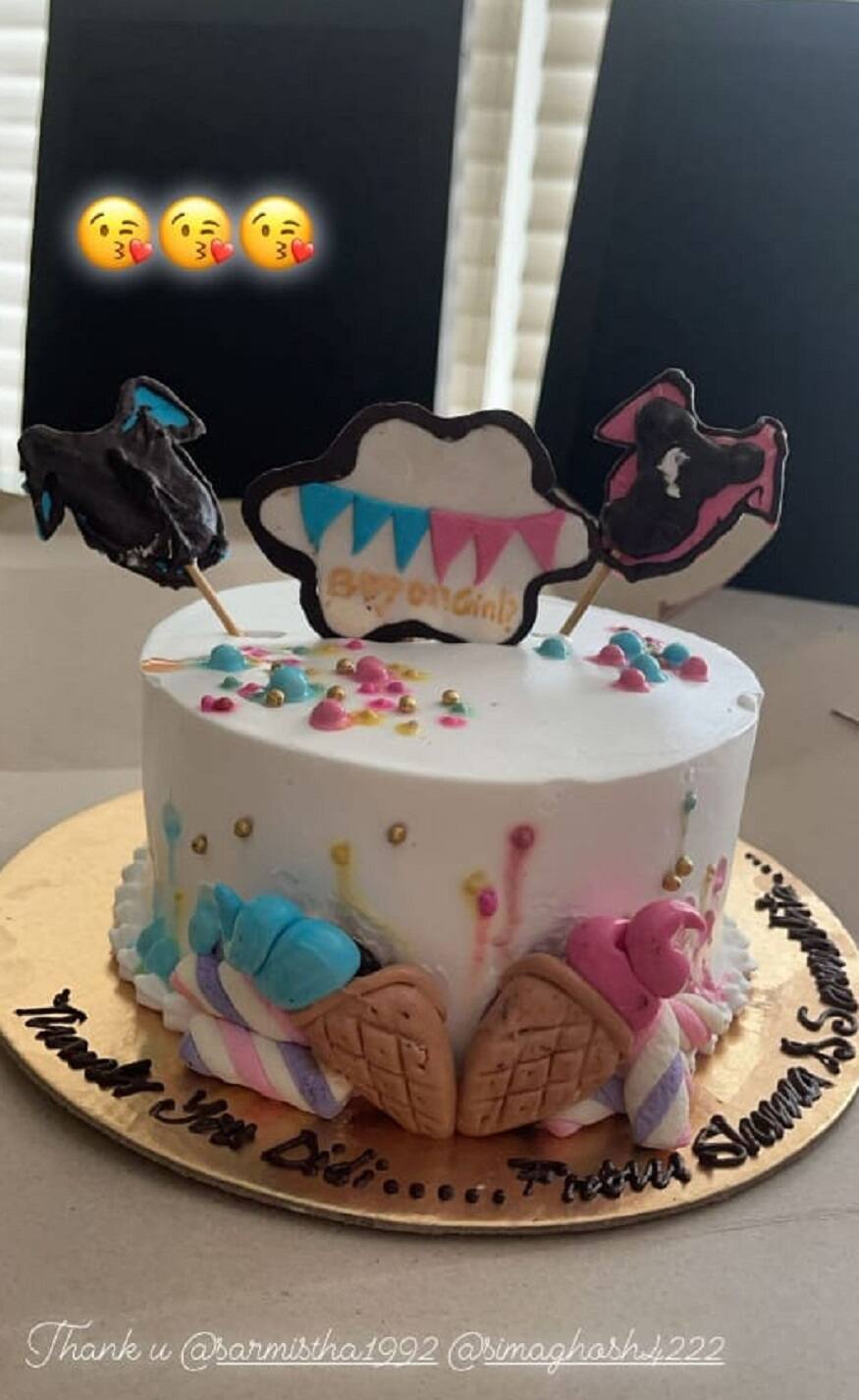 ছবিতে দেখা যাচ্ছে, একটি সাদা রঙের কেক, যার মধ্যে আকাশি ও গোলাপি রঙের নকশা করা। সঙ্গে দুই রঙের আইসক্রিম আকারের আইসিং। উপরে লেখা বয় অর গার্ল। নিচে লেখা ধন্যবাদ দিদি।