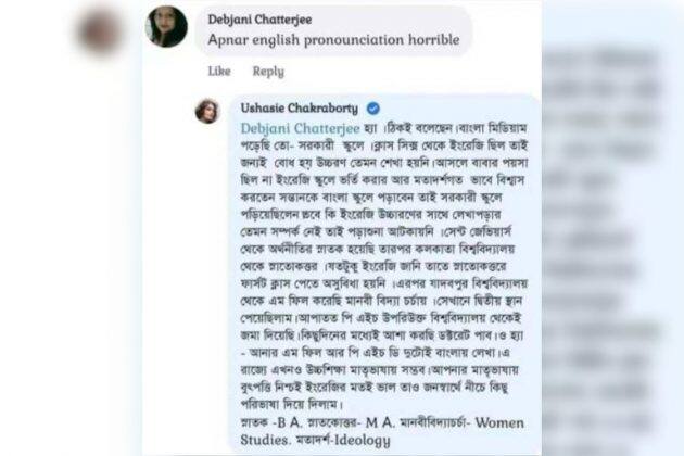 উষসী সেই কমেন্টে আরও লিখেছেন, "সেন্ট জেভিয়ার্স থেকে অর্থনীতির স্নাতক হয়েছি। তারপর কলকাতা বিশ্ববিদ্যালয় থেকে স্নাতোকত্তর। যতটুকু ইংরেজি জানি তাতে স্নাতোকত্তরে ফার্স্টক্লাস পেতে অসুবিধা হয়নি। এরপর যাদবপুর বিশ্ববিদ্যালয় থেকে এমফিল করেছি মানবীবিদ্যা চর্চায়। সেখানে দ্বিতীয় স্থান পেয়েছিলাম। আপাতত, পিএইচডি উপরিউক্ত বিশ্ববিদ্যালয় থেকেই জমা দিয়েছি। কিছুদিনের মধ্যেই আশা করছি ডক্টোরেট পাব। ও হ্যাঁ, আমার এমফিল আর পিএইচডি দুটোই বাংলায় লেখা৷। এ রাজ্যে এখনও উচ্চশিক্ষা মাতৃভাষায় সম্ভব।"