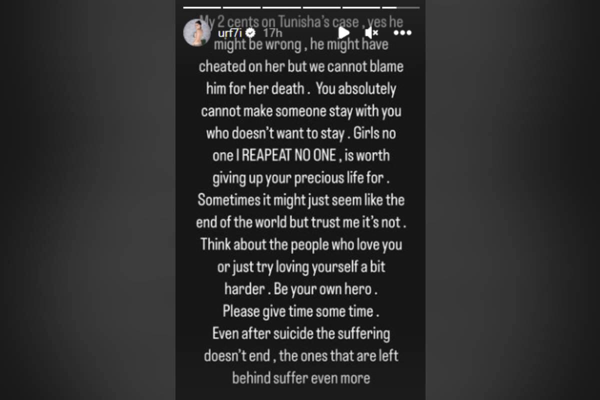 দু'জনের সমীকরণ নিয়ে যখন অসংখ্য প্রশ্ন উঠছে, তখনই এ বিষয়ে নিজের বক্তব্য জানালেন অভিনেত্রী উরফি জাভেদ। ইনস্টাগ্রাম স্টোরিতে তিনি লেখেন, 'ও (সিজান) হয়তো ভুল করেছে। হয়তো সম্পর্কে থাকাকালীন বিশ্বাসঘাতকতাও করেছে। কিন্তু তুনিশার মৃত্যুর জন্য আমরা ওকে দায়ী করতে পারি না। কেউ থাকতে না চাইলে তাকে জোর করে নিজের সঙ্গে রাখা যায় না।"
