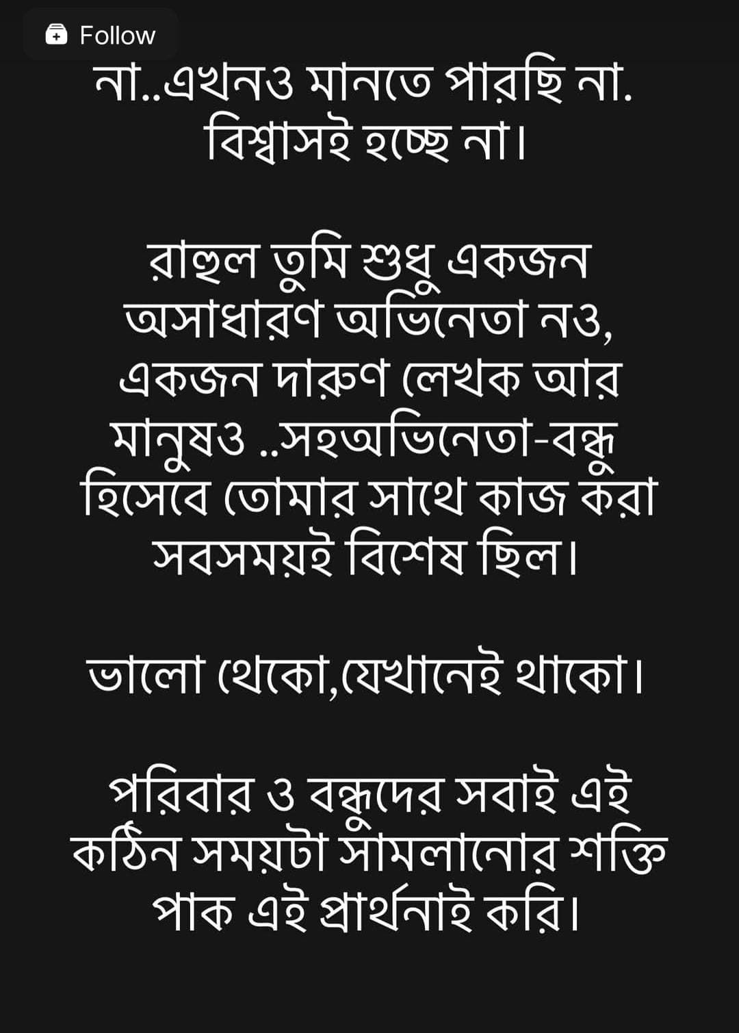 এদিন তিনি লেখেন, না… এখনও মানতে পারছি না, বিশ্বাসই হচ্ছে না। রাহুল তুমি শুধু একজন অসাধারণ অভিনেতা নও, একজন দারুণ লেখক আর মানুষও…